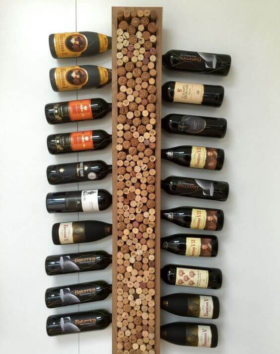 The bottles rest horizontally, their necks secured against the cork wall, giving the whole piece a stylish, eco-friendly look. To recreate this, save up your corks, build a slim wooden frame, and glue the corks inside until it s packed solid.