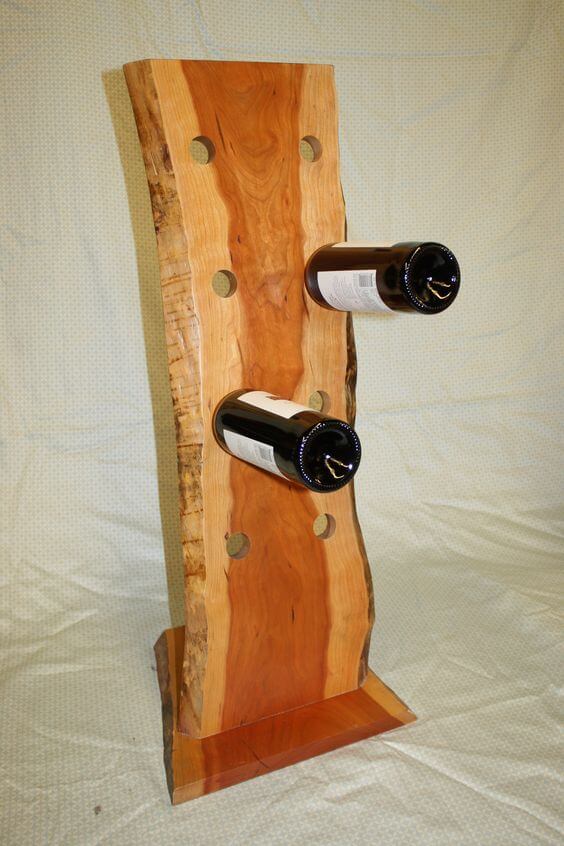 This wood slab wine rack is a true statement piece that combines nature s raw beauty with functionality. A single slab of wood, complete with its natural edges, is transformed into a vertical display by drilling angled holes for bottles to slide into.