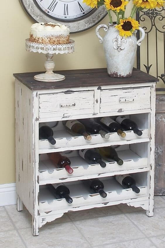 The distressed paint and vintage look give it farmhouse charm while still being practical. To recreate this, measure and cut wooden slats or buy pre-made wine rack inserts to fit inside the dresser frame.