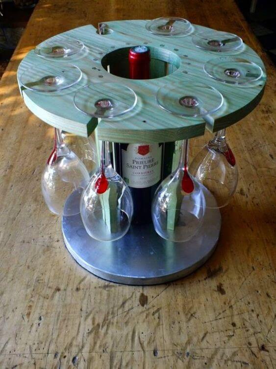 A single bottle sits securely in the center, making it both practical and stylish for small spaces. To make your own, sand down a spool top, drill or cut glass slots evenly around the circle, and mount it onto a sturdy base.