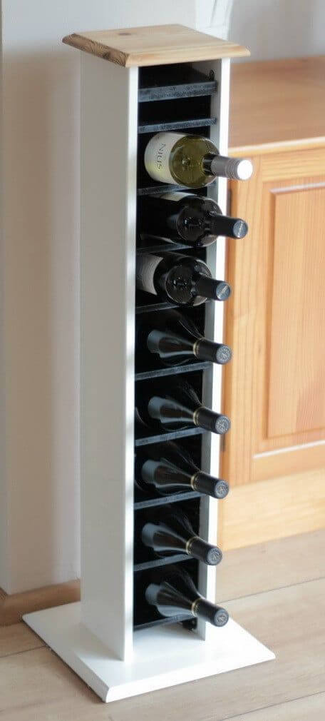 The tall, slim design takes up very little floor space, making it ideal for small apartments or kitchens. Painted or stained, it can blend in with modern or rustic décor, while holding several bottles neatly in place.