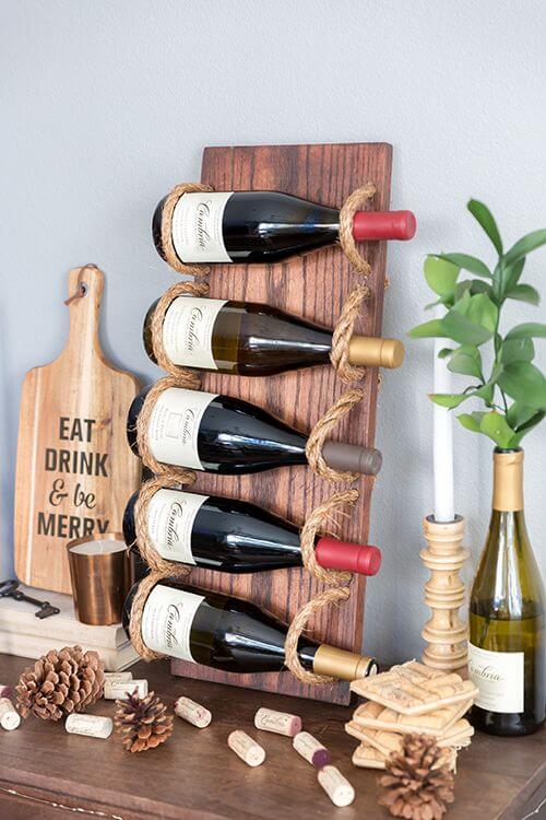 To make your own, grab a solid wood plank, sand and stain it, then attach heavy jute rope in loops using strong nails or screws. Slide your bottles through the loops so they rest horizontally, keeping the corks moist.