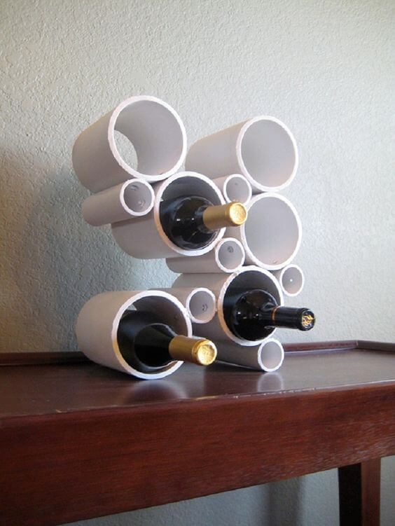 This modern wine rack idea uses simple PVC pipes to create a stylish and affordable storage solution. The different pipe sizes add a fun, geometric look while keeping bottles neatly tucked away.