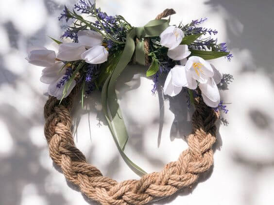 To make your own, braid three lengths of rope together, then form them into a circle and secure with hot glue or wire. Add faux or real flowers to the top, finishing with a ribbon for a polished look.