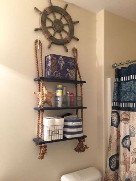 This nautical shelving idea is both functional and decorative, perfect for a beach-themed bathroom or coastal-inspired home. The thick rope not only holds the shelves securely but also adds a rustic, seaside charm that feels warm and inviting.