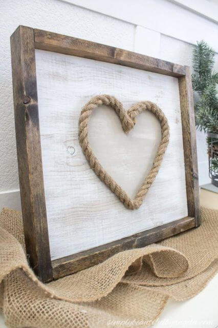 This rustic rope heart art is a beautiful way to bring warmth and love into your home décor. The natural jute rope shaped into a heart against the whitewashed wooden background creates a sweet yet simple statement piece.