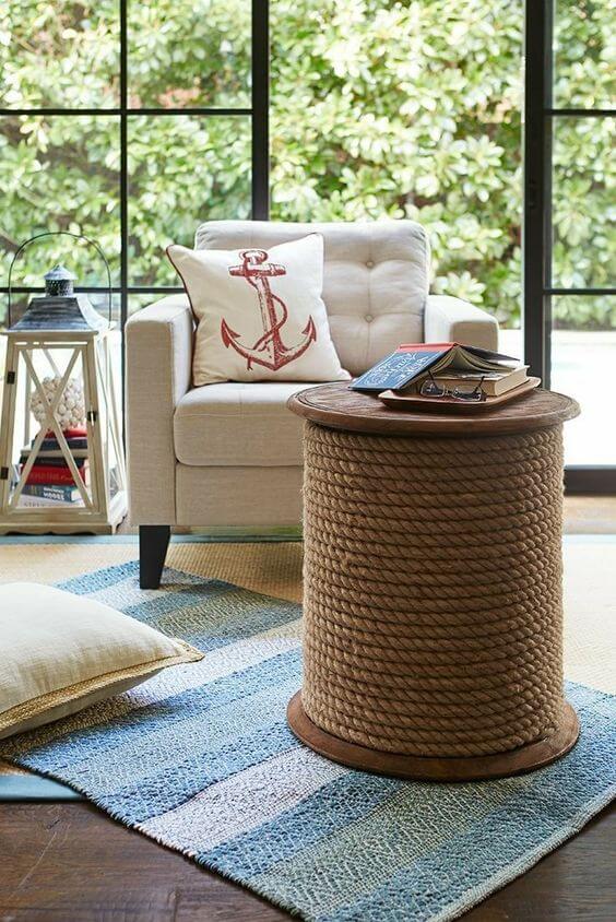 It works beautifully as a side table in a living room, adding natural texture and a nautical vibe. To recreate it, start with a wooden spool or cylindrical base, then secure the rope with hot glue as you wrap it around.