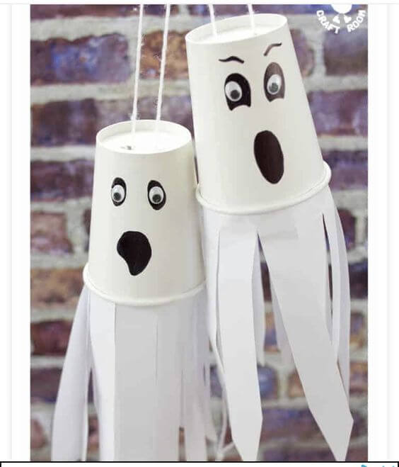 For the ghost s flowing body, cut strips of white paper or tissue and attach them inside the cup so they dangle down. Punch a small hole at the top, thread a piece of string through, and you ve got a hanging decoration ready to sway with every breeze.