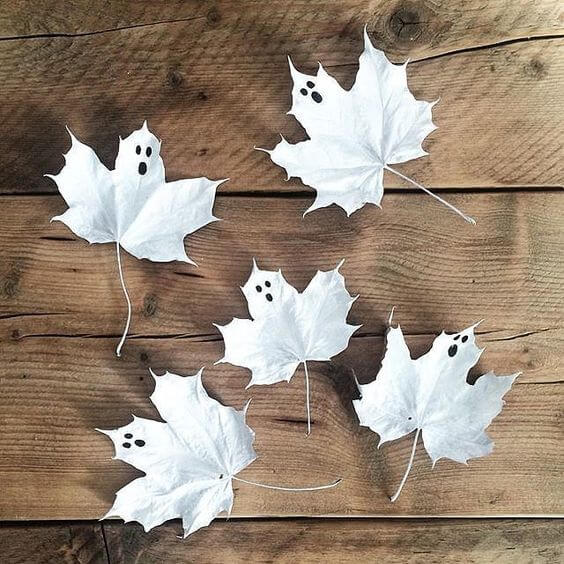 Brush the leaves with white paint until they re fully coated, then let them dry before adding two round eyes and a little mouth. You can scatter them across your table for a festive touch or string them together to make a spooky-cute garland.