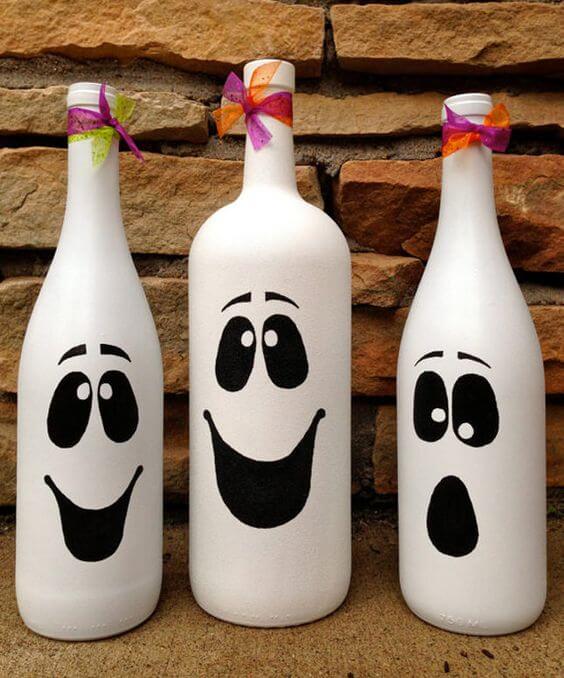 Use black paint to create expressive ghost faces, happy, surprised, or even silly, and give each one its own personality. A small ribbon tied around the neck of the bottle adds a cute finishing touch and a splash of color.