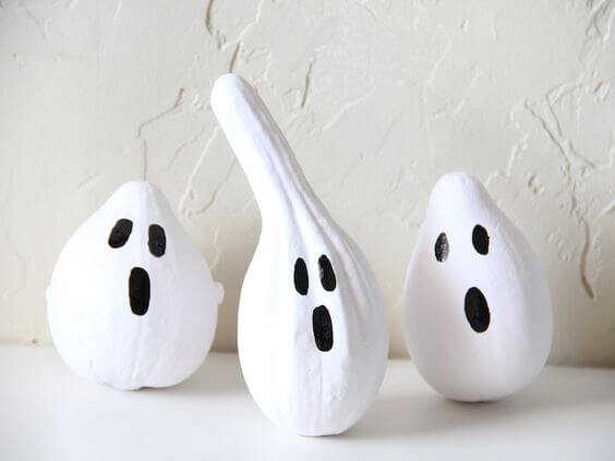 Transform plain gourds into adorable little spirits with just a bit of paint. Their natural shapes already have quirky curves, so once you cover them in white and add black eyes and mouths, they instantly look like a ghostly family.