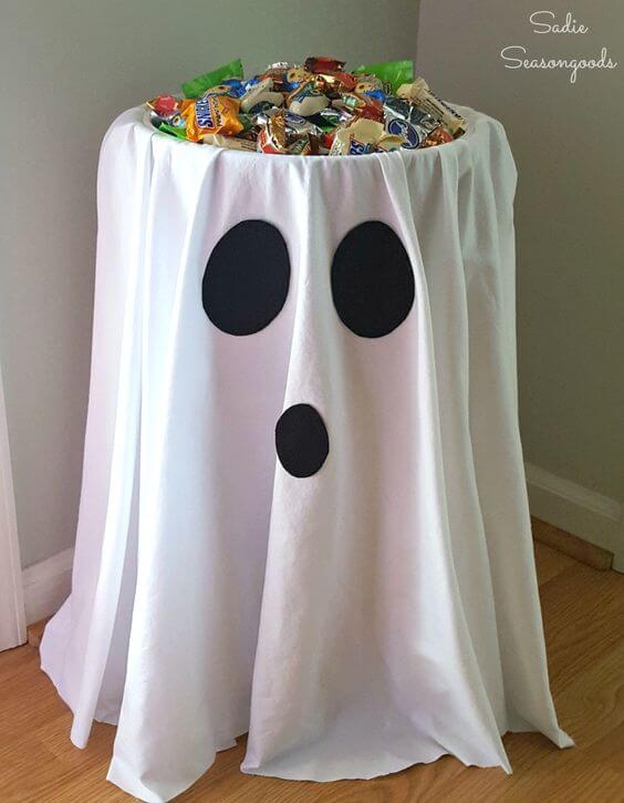Cut out large black felt or paper circles for the ghost s eyes and mouth, then attach them with fabric glue or tape. Place a big bowl of candy on top, letting the fabric flow naturally around it.
