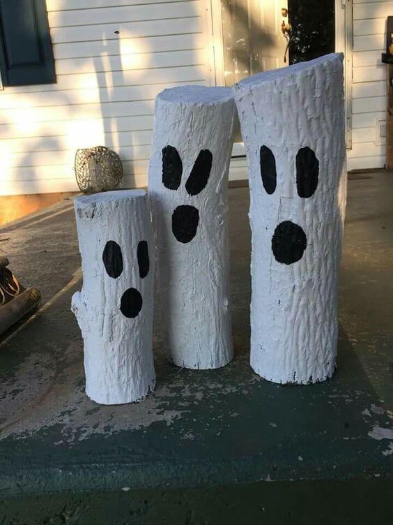 These painted ghost logs are a fantastic way to reuse old wood while adding a touch of Halloween charm. Grab a few logs or branches, give them a coat of white outdoor paint, and let them dry.