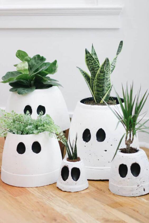 Flip the pots upside down, give them a few coats of white, and then add big oval eyes for a simple ghostly face. Once they re dry, pop your favorite houseplants inside, and suddenly your greenery looks ready for a Halloween party.