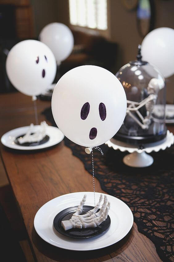 These balloon ghost tablepieces bring a fun and quirky vibe to your Halloween dinner setup. White balloons are decorated with simple ghost faces and anchored to plates using skeleton hands, making them look like spooky little guests floating at the table.