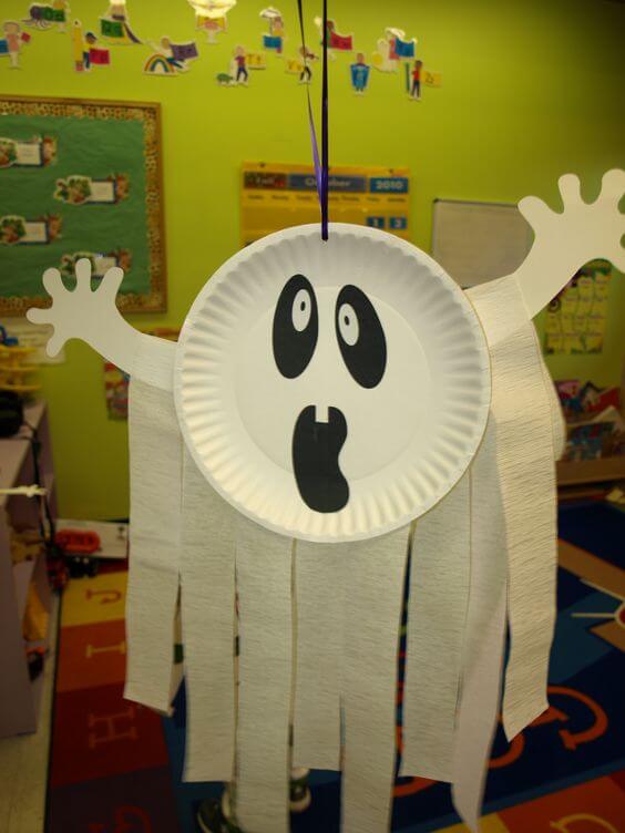 Cut out simple oval shapes for the eyes and a big, spooky mouth, then glue them onto the plate. Tape or staple long strips of paper to the bottom so they flutter like a ghost floating through the room.