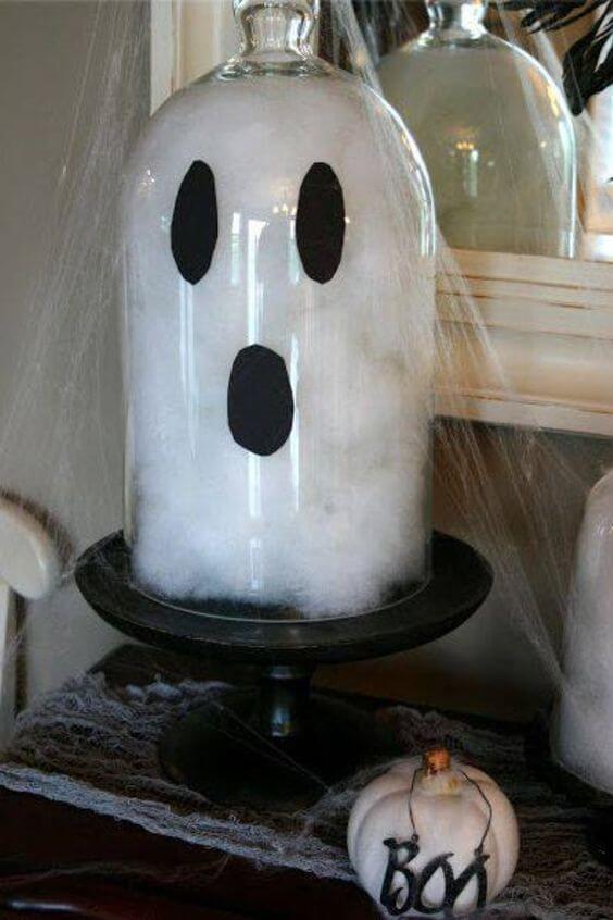Fill the dome with the cotton until it looks like a floating mist, then attach the face pieces to the glass. The result is a ghostly figure trapped inside, glowing softly if you add a small LED light underneath.