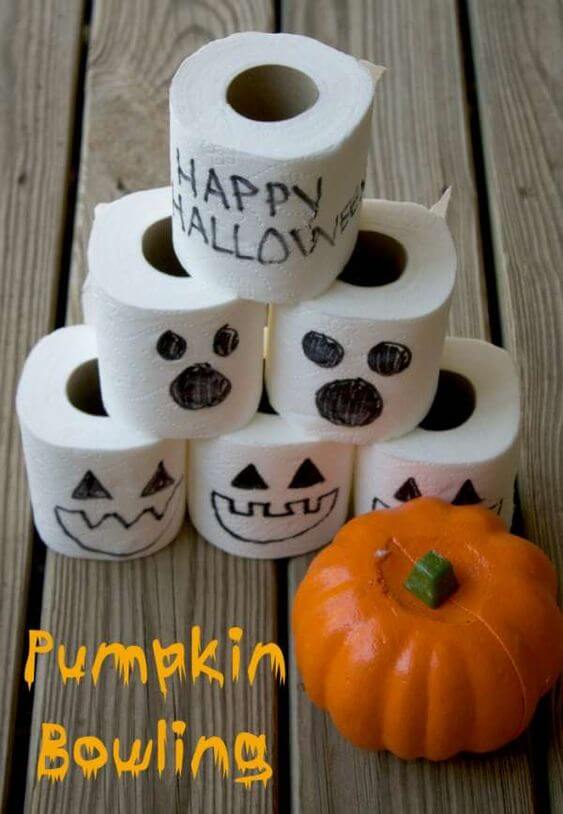 Stack them up like bowling pins, and use a small pumpkin as your bowling ball. It instantly becomes pumpkin bowling for kids and adults alike. You can keep the designs simple or let your creativity run wild with different expressions.