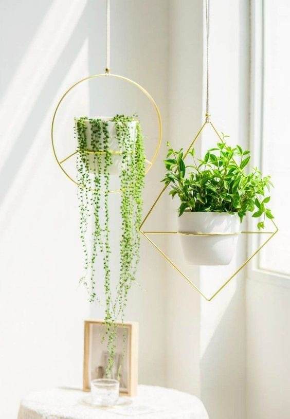 A gold ring hanging planter can be made from gold metal rings, gold floral wire, a clay flower pot, and a brass planter chain. It provides a more elegant way to watch your plants thrive.