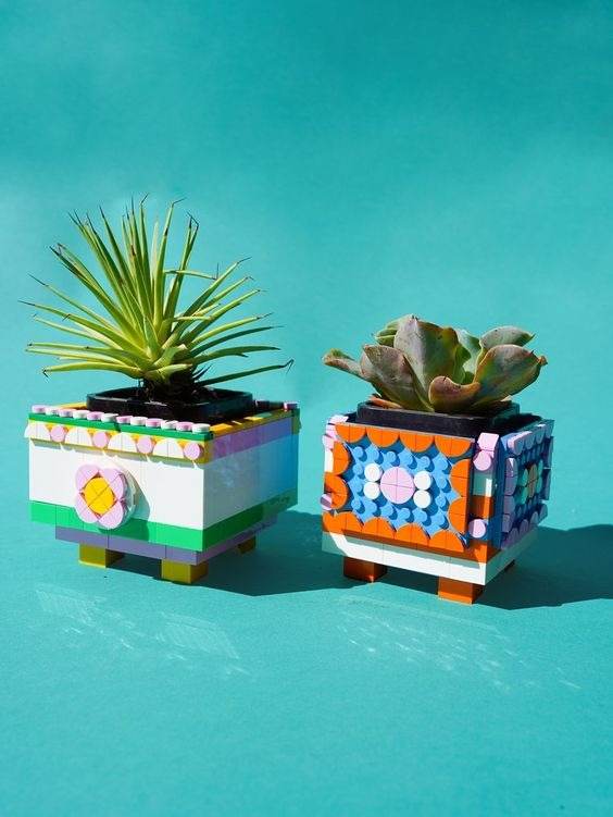 Both children and adults can nail this DIY project. One of the most important steps is to drill a hole in the bottom of each LEGO planter for drainage.