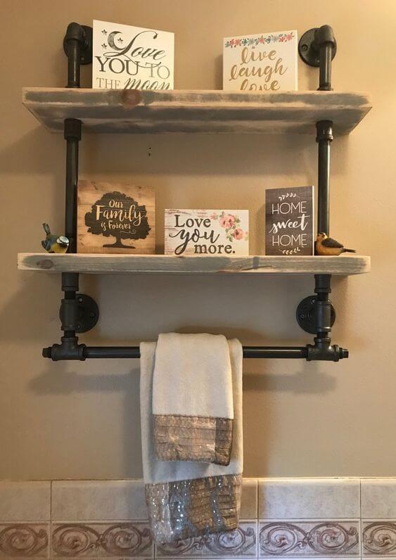 The pipes act as strong supports and towel holders, while the wooden boards provide space for décor, toiletries, or extra towels.