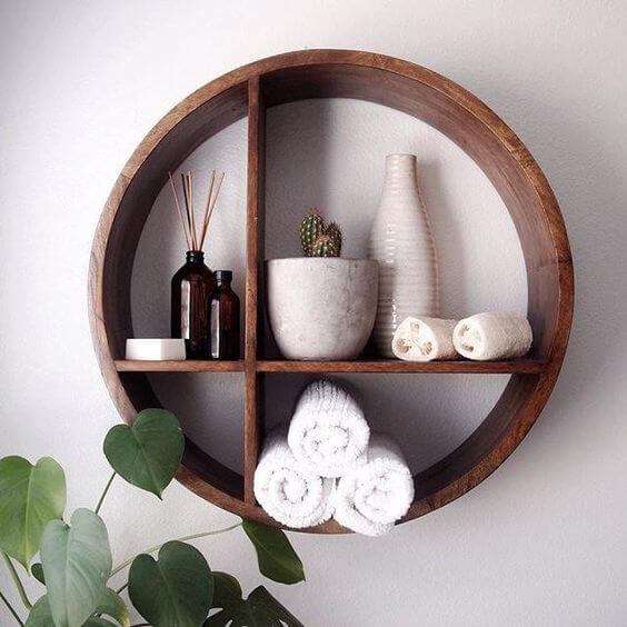 This round wall shelf made from a half wine barrel is a perfect mix of rustic and modern. Its circular shape instantly grabs attention while the wooden cross dividers make it practical for organizing essentials like rolled towels, jars, or small plants.