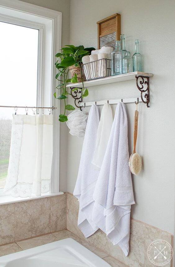 This farmhouse bathroom shelf captures that cozy, rustic charm while keeping things organized. A simple wooden plank, supported by ornate wrought iron brackets, doubles as both décor and function.