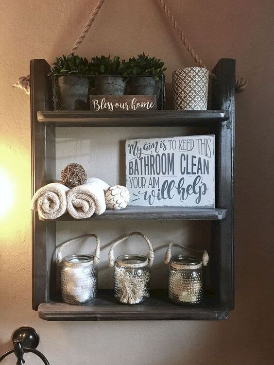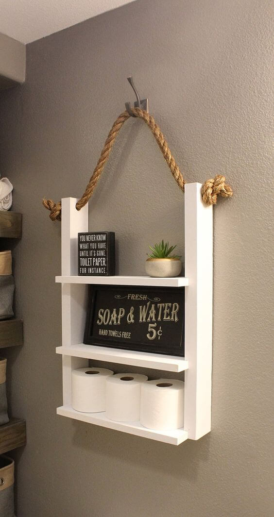 To recreate this look, choose reclaimed wood for a weathered finish that pairs beautifully with natural rope. Hang it securely on a wall or behind the toilet, and you ll have an eye-catching storage piece that keeps essentials tidy and stylish.