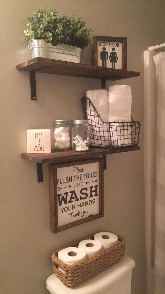 Each shelf offers room for toilet paper rolls, decorative signs, or even small potted plants to add greenery. To make one yourself, cut wooden planks into equal lengths, paint them in a bright white, and secure them with side supports.