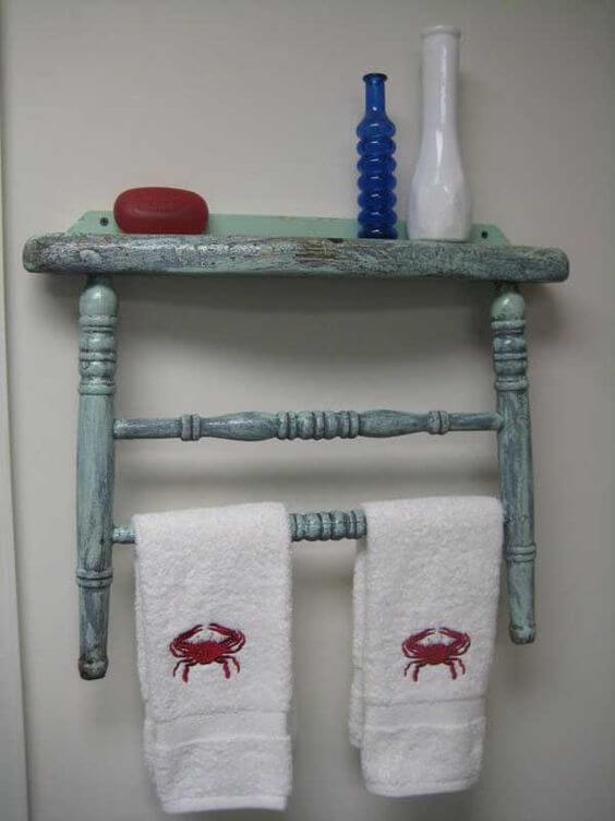 Instead of tossing an old chair, you can transform it into a unique bathroom shelf. By cutting off the seat and attaching the backrest to the wall, you instantly gain a shelf on top and towel bars below.