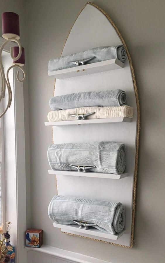 Bring a touch of coastal charm into your bathroom with this boat-inspired towel rack. Designed like the front of a sailboat, it s fitted with multiple horizontal shelves, each one holding rolled towels securely in place with nautical cleats.