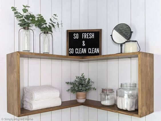 This floating corner shelf is a clever way to use often overlooked bathroom space while adding a touch of modern rustic charm.