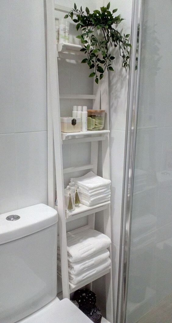 Painted white, it blends seamlessly into bright, modern bathrooms and keeps the area looking clean and airy. To recreate, lean a premade ladder shelf against the wall or build one from simple planks and crossbars.