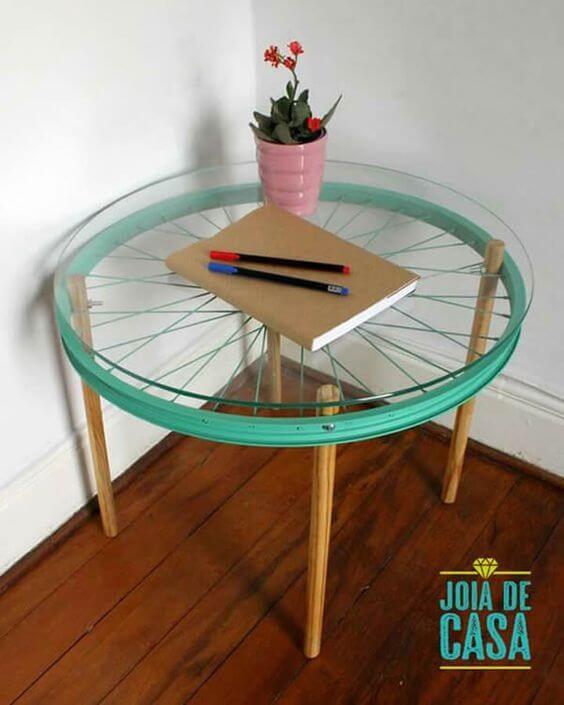 Build a conversation piece by transforming a bike wheel into a small garden table. Use the wheel as the base and attach a circular glass or wooden top. Spray-paint the metal in your preferred color for a sleek look.