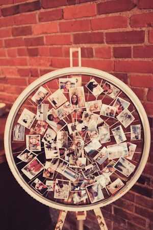 Create a personal photo display using an old bike wheel. Remove the tire, clean the rim, and hang it on the wall. Use small clothespins to clip photos or postcards along the spokes.