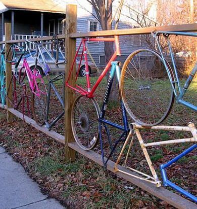 Incorporate bike wheels or frames into your garden fence design. Arrange them vertically or horizontally and secure them with wire or wooden posts. The circular shapes create an interesting contrast with traditional fencing.