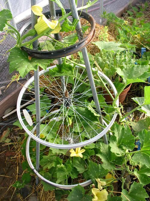 Old bike wheels make excellent trellises for climbing plants. Remove the tires and mount the wheels on a wooden post or metal rod. The circular frame supports vines like peas, beans, or morning glories beautifully.