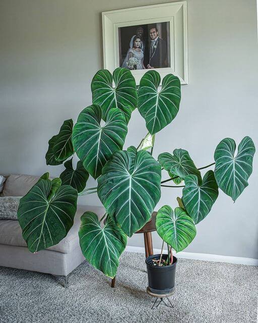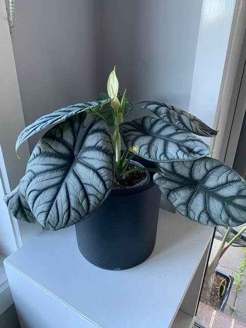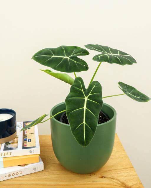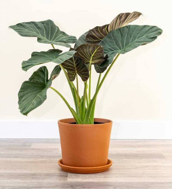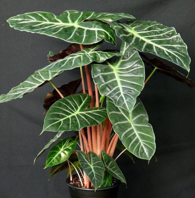 The Amazonian Elephant Ear has arrowhead-shaped leaves with high-contrast white veins that make it truly eye-catching. It has a sleek, futuristic vibe that blends well with modern interiors.