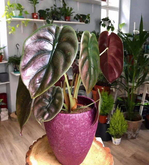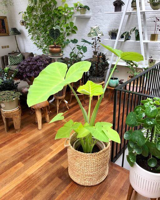 Taro is a classic favorite with its heart-shaped leaves that feel both familiar and exotic. It brings a soft, tropical mood that instantly refreshes any indoor corner. This plant loves damp soil and thrives in warm, humid conditions.