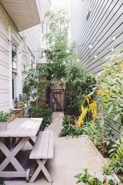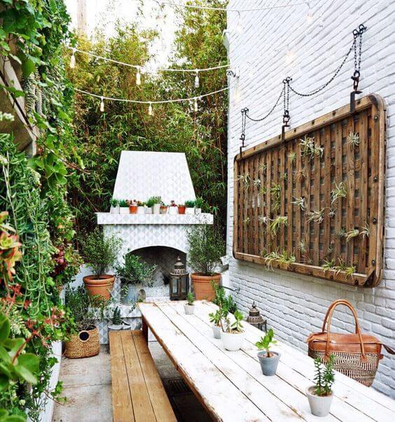 Source: InspirationsdecoThis narrow garden corner blends privacy and charm with its crisp white fireplace and long rustic dining table. Surrounded by lush pots and a wall of green, the space feels like a small escape from the indoors.