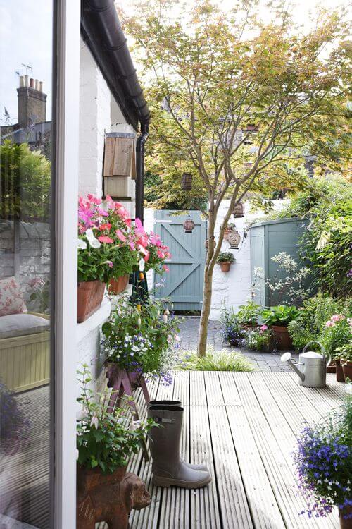 You can line your walls with colorful annuals, use coordinated pots for a cohesive look, and place a tree in the middle for structure. Even the tiniest deck can become a garden escape when you layer it thoughtfully like this.