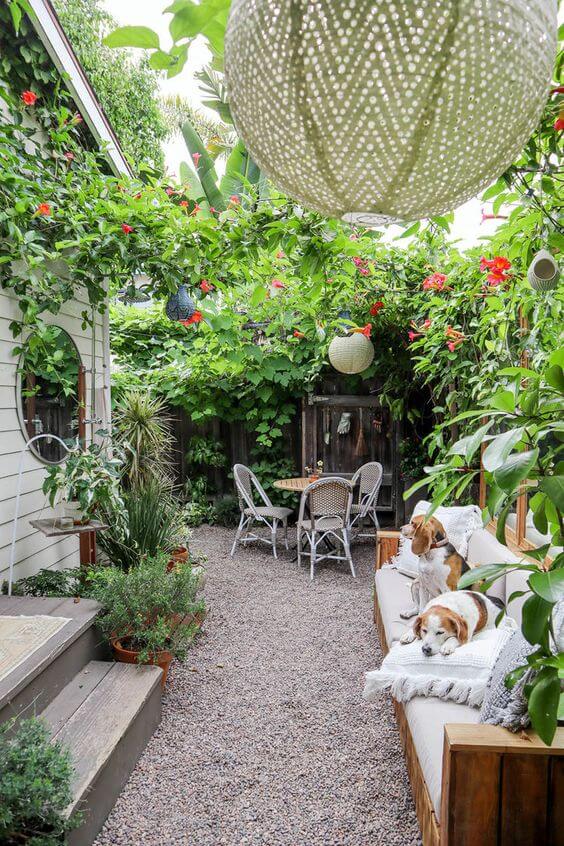 Source: DominoLush greenery and trailing vines embrace the space, while red blooms and string lanterns add a soft, magical glow. The gravel path, paired with a cozy outdoor sofa and a petite bistro table, invites both lazy lounging and intimate dinners.