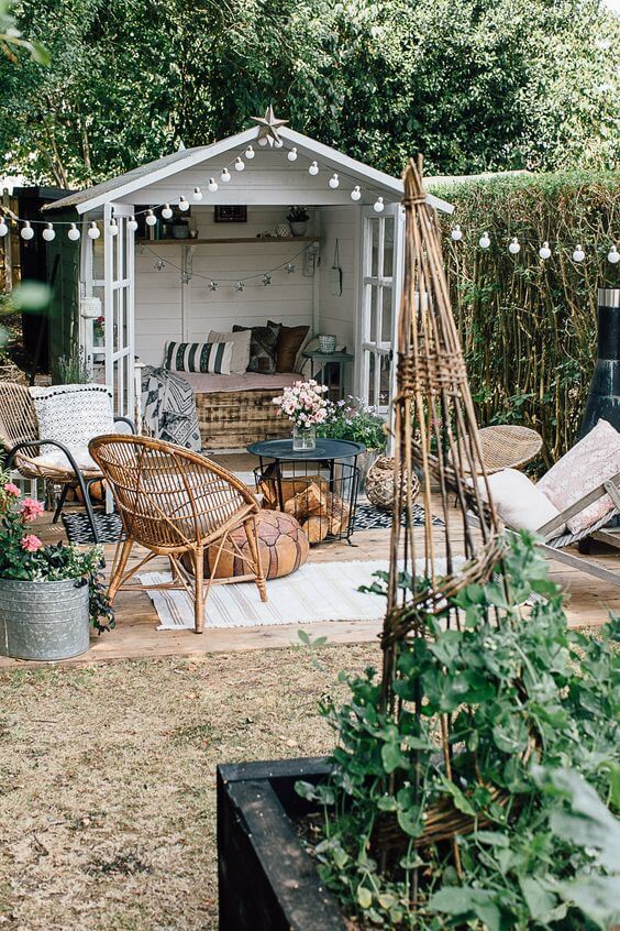 Source: RockmystyleThis cozy garden setup features a small white shed that feels like a peaceful hideout right in your backyard. A few comfy chairs and string lights turn the space into a casual hangout spot for reading, relaxing, or having tea with friends.