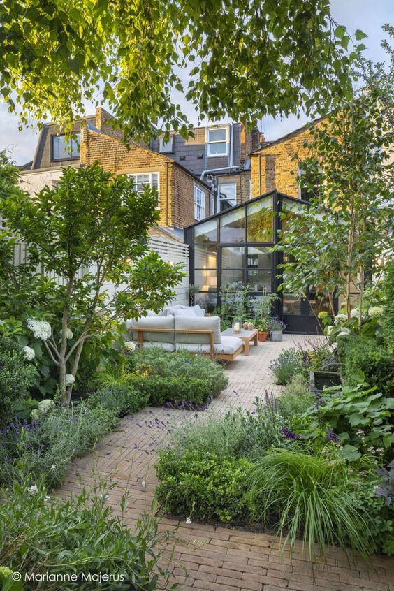 Source: GardenclublondonThis backyard blends a modern greenhouse structure with a soft, winding brick path and thick greenery.
