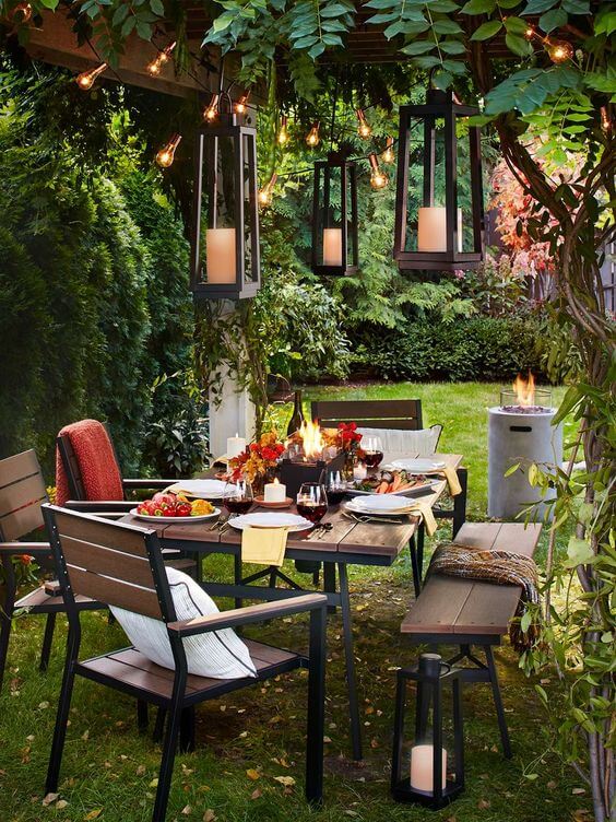 Source: TargetThe wooden table is set beneath a vine-covered pergola, with string lights and lanterns casting a soft glow as evening falls. A mix of chairs and benches adds flexibility and comfort, while nearby plants bring privacy and peace.