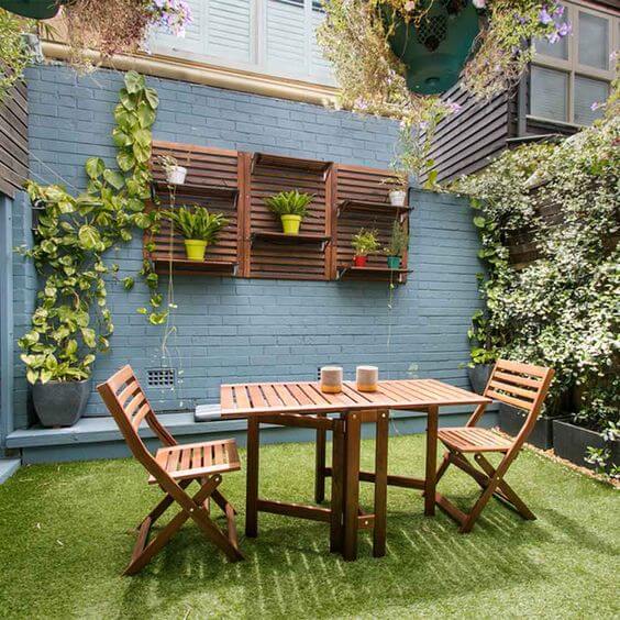 Source: FamilyhandymanThis small courtyard creates a cheerful spot to relax or enjoy coffee outdoors. A simple wooden bistro table and foldable chairs sit on artificial grass, adding comfort and ease.