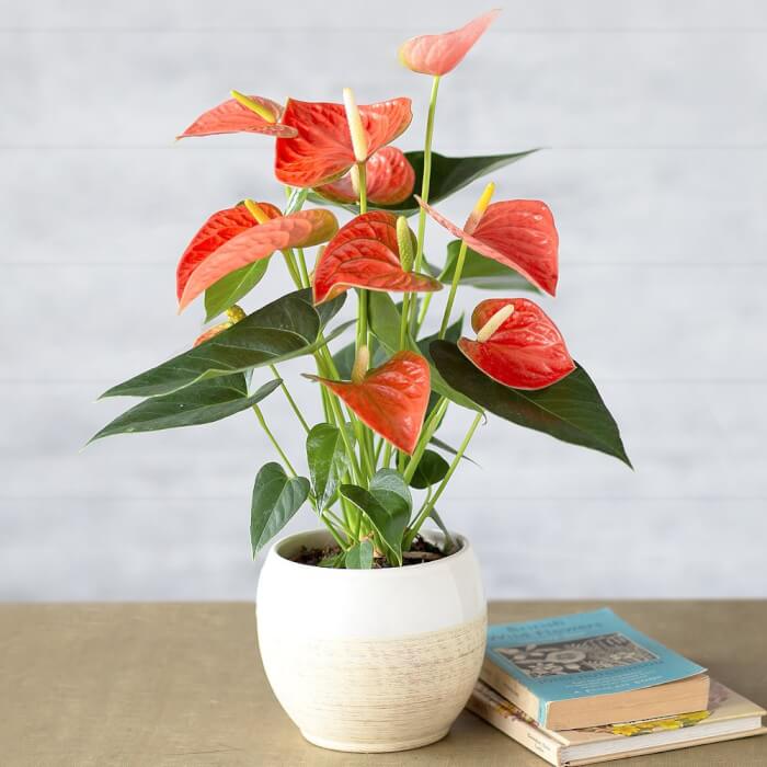Source: BunchesAnthurium boasts heart-shaped leaves and long-lasting red or pink flowers. It does best in indirect morning sunlight, which encourages blooming without burning its foliage.