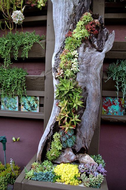 In this creative planter, succulents are artfully arranged within the crevices and pockets of a piece of driftwood, creating a living work of art.