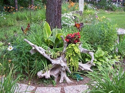 Placing a driftwood sculpture amid greenery and plants serves as a captivating focal point. The weathered and organic qualities of the driftwood blend harmoniously with the lush greenery, offering a tranquil and visually pleasing garden feature.