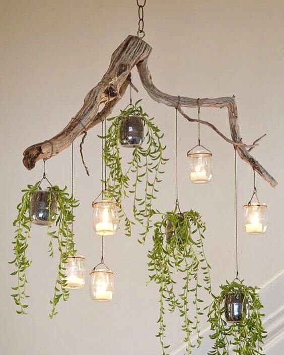 This combination of driftwood, mason jars, and plants not only serves as an illuminating centerpiece but also creates a harmonious blend of nature and design, making it a stunning and imaginative addition to your indoor or outdoor decor that adds character, warmth, and life to your living space.